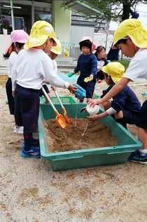 今日は砂場遊びをしましょう。年長組のお友達は去年のことを思い出しながら『型抜き』をして遊ぶようです。型抜き用の土を作ろう!友達と水を足して混ぜ始めました。