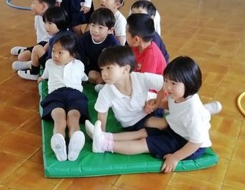 ばら組さんが普段から取り組んでいる「カメ」のポーズ。できるかな?と心配していた子ども達でしたが、全員上手にしていましたよ。他にも「とんぼ」「こま」など難しいことにも挑戦しましたよ。ばら組のお友達に「すごい、できてるよ」「上手」とほめてもらい、うれしそうにしていました。