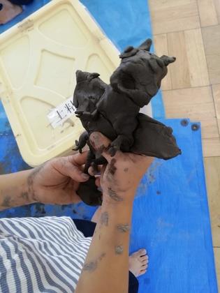 ひんやり冷たくて触り心地を楽しんだ後は、何をつくろうかなあ。食べ物やキャラクター。お団子を長く積み上げる等を作って楽しみました。