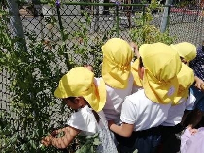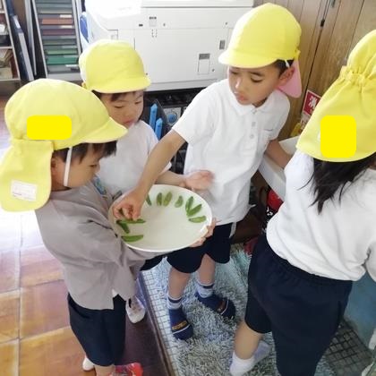 スナップえんどうが沢山実りました。年長組が収穫しています。「あっ!ここにもあった!」「これも大きい!」「食べたいなあ」取りたてを頂くことにしました。