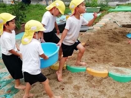 そんなお兄ちゃんの姿を見て、年少組のお友達もやってきました。「教えてあげようか。ここの土を使うねんで」見様見真似でやってみる年少組。明日もたくさん遊ぼうね!