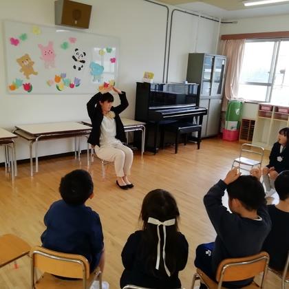 こちらは年少組の様子です。『むすんでひらいて』の歌を歌った後にピアノに合わせて色んな物に変身します。カエル・カメ・ちょうちょう・車になって自由に表現しました。