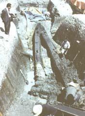 巨大な木製品を前に、彼は考え込んでしまいました。今後の調査の段取りをどうしよう。何よりこの正体はなんや。気を取り直した彼は、田代克巳記念物係長(現帝塚山短期大学教授)に電話を入れました。「係長、えらいもんが出ました。すぐ見に来てください」