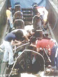 修羅の保存処理にあっては、(2)のポリエチレングリコール法が採られることになりました。ポリエチレングリコールは、身近なものでは口紅のスティックの主原料に使われている無色透明、無臭の水溶性の樹脂で、温度を上げれば液化し、逆に下げれば固化するという性質をもっています。この性質を利用した保存処理では、摂氏60度以上のポリエチレングリコール水溶液に木製品を浸し、木材に含まれている水分を交換しようとするものです。水溶液の濃度を徐々に上げ、100%水分をポリエチレングリコールに置換し、温度を下げて固化するのです。