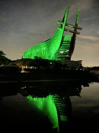 新型コロナウイルスの感染者や医療従事者などへの差別をなくし、みんなが笑顔で「ただいま」「おかえり」と言い合えるまちづくりの実現を願い、シトラスグリーンにライトアップしました。