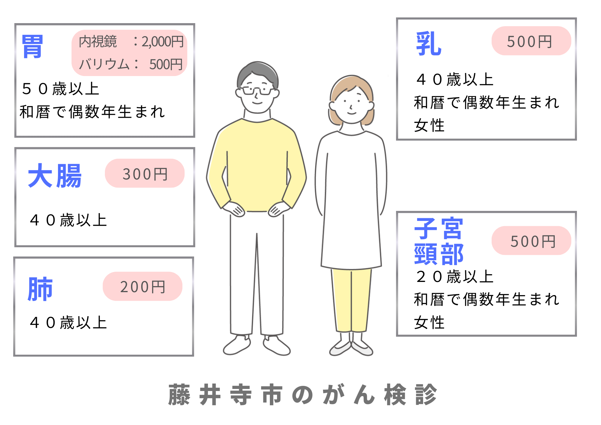 藤井寺市では、胃がん検診・大腸がん検診・肺がん検診・乳がん検診・子宮頸がん検診を実施しています。市の助成で、お得に受診いただけます。