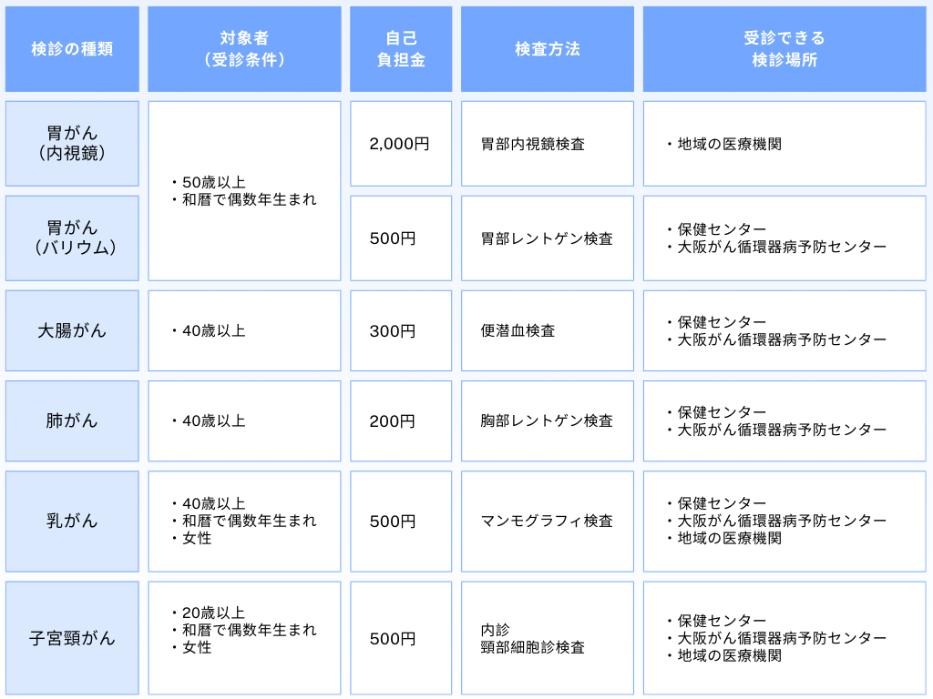 胃がん検診(バリウム)、大腸がん検診、肺がん検診、乳がん検診、子宮頸がん検診