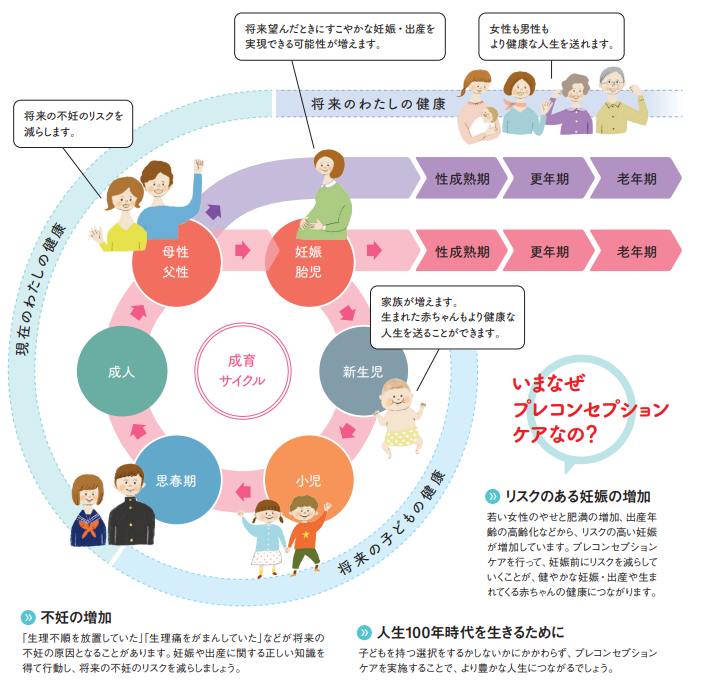 プレコンセプションケア、略して「プレコン」とは、プレ(Pre)は「~の前」、コンセプション(Conception)は「妊娠・受胎」という意味で、性や妊娠に関する正しい知識を身に付け健康管理を行うよう促すことをさします。プレコンは、子供を持ちたい人もそうでない人にも、誰にとっても若いうちからの将来に向けての大切な取組です。