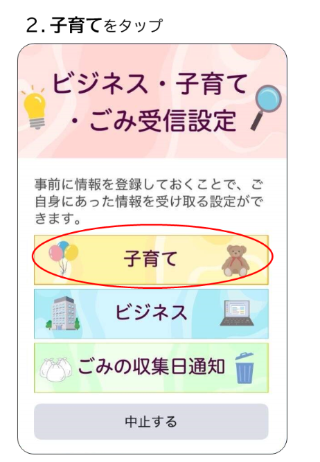 「ビジネス・子育て・ごみ受信設定」画面が表示されるので、「子育て」をタップ