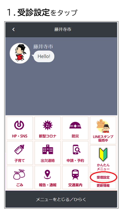 藤井寺市公式LINEのトーク画面を開き、メニュー右下の「受信設定」をタップ