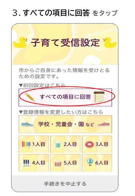 「すべての項目に回答」をタップし、お子さんの人数、生年月日、所属する学校等の情報を入力してください。