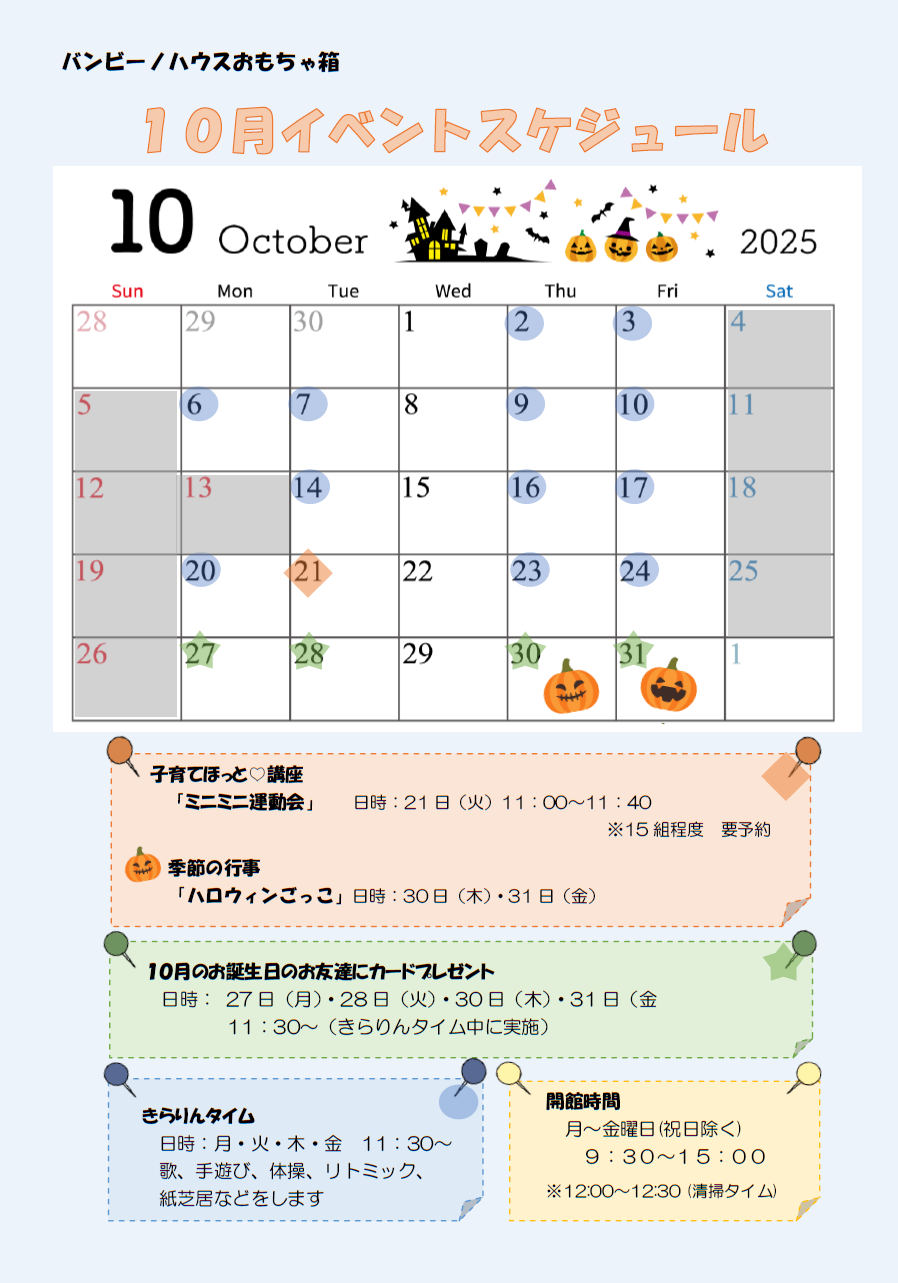 バンビーノハウスおもちゃ箱10月イベントスケジュール (PDFファイル: 389.9KB)