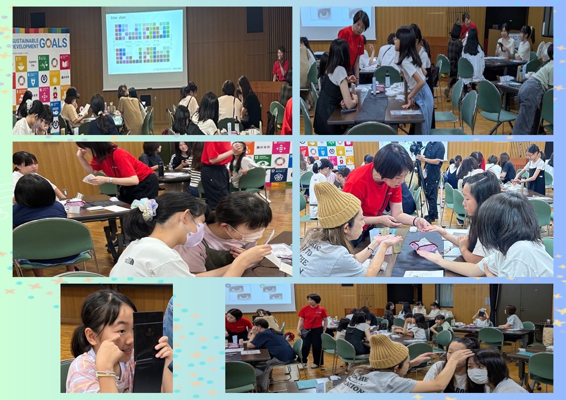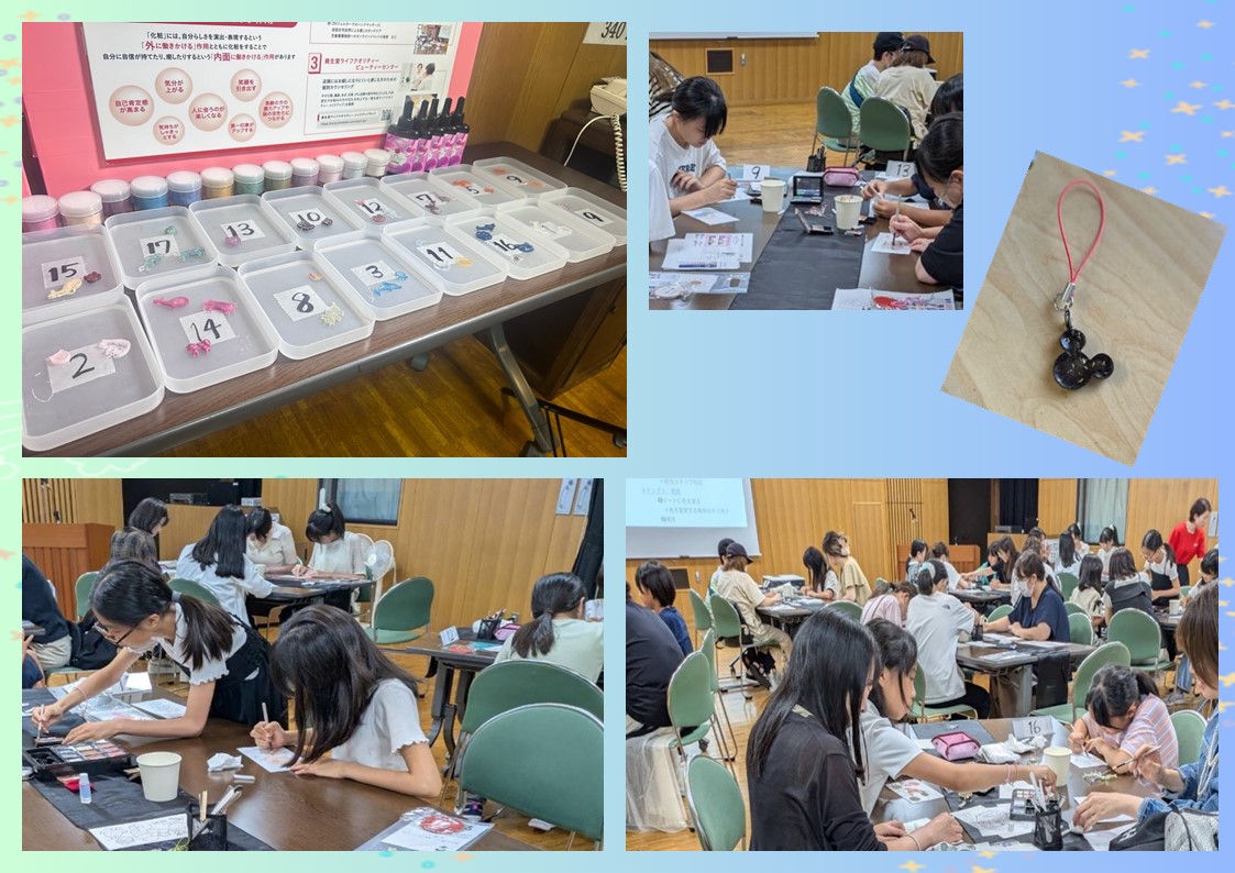 資生堂ジャパン株式会社の講師の方をお迎えし、17組40名の方々に参加していただきました。正しいスキンケアの方法として、洗顔料の泡立てや保湿、日焼け止めの効果的な塗り方を実践しました。また、SDGsの取り組みとして、廃棄するアイシャドウでの塗り絵やキーホルダー作り等を体験していただきました。