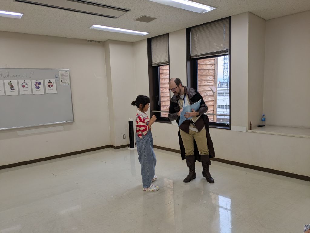 仮装したALT(外国人英語指導助手)と一緒にアイセル シュラ ホールの3階を貸し切って、各コーナーに分かれ、楽しく英語を学ぶことを目的とした親子参加型のイベントで、小学1~3年生を対象に、親子11組の皆様にご参加いただきました。