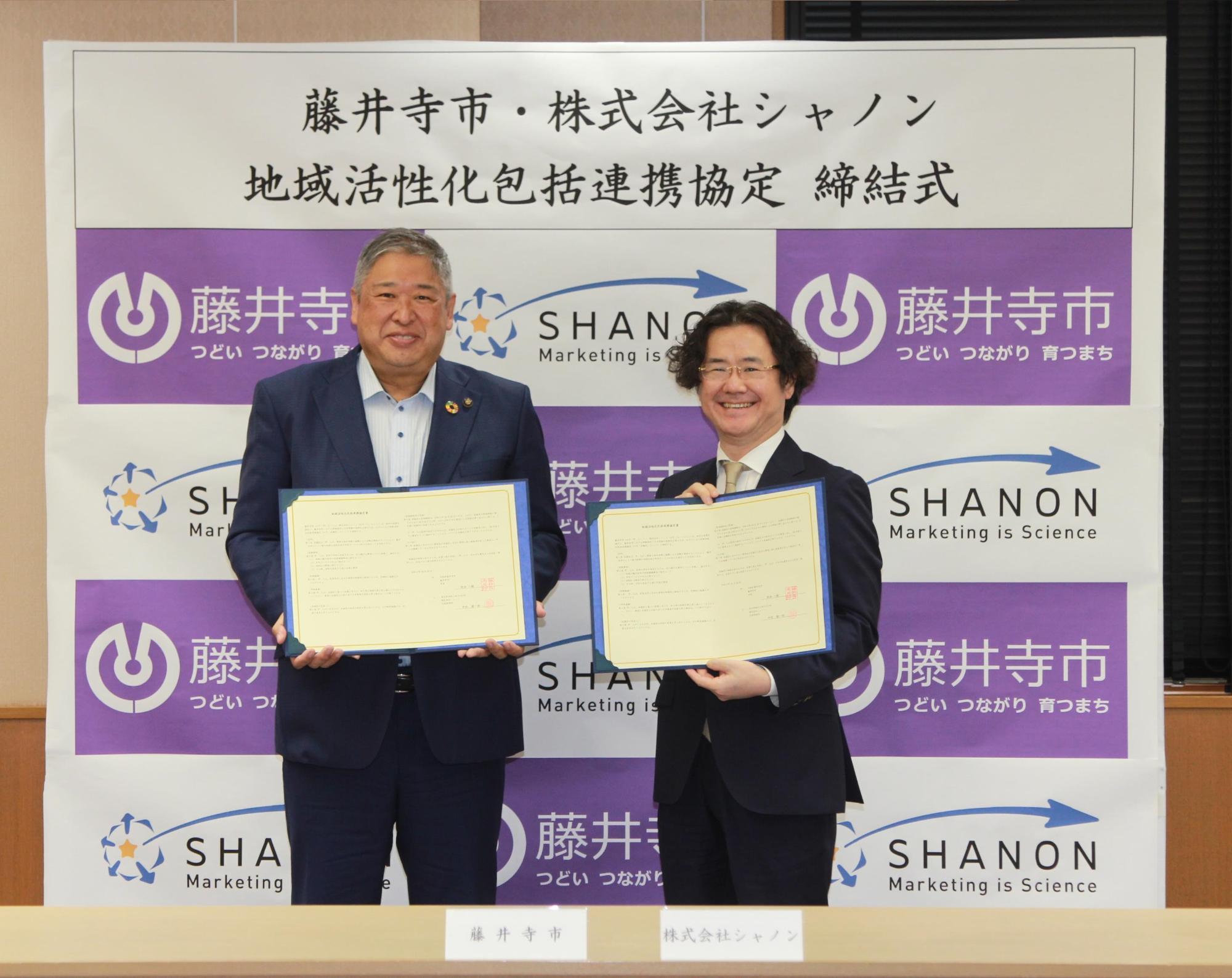 藤井寺市と株式会社シャノンは、データ収集や分析を活用したマーケティング支援による地域課題の解決や地域活性化につなげるため、包括連携協定を令和3年10月25日に締結しました。