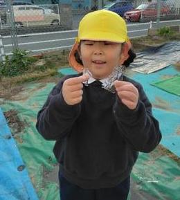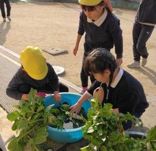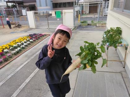 冬休みの間、幼稚園の畑でぐんぐん大きくなっていた大根。年少組のお友達が「大根ぬきたい!」「よいしょ!よいしょ!」と引き上げました。