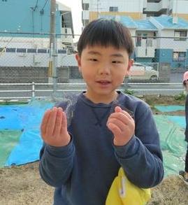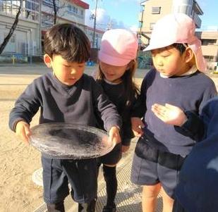 園庭のビニールシートのくぼみに氷がはっているのを見つけた子ども達。すぐに「氷や!氷出来てる!」「触ってみたい」「うわっ!めっちゃ冷たいわ~寒いからかなあ・・・」友達とおしゃべりしながら持ってみたり、掲げてみたりして楽しみました。自然の力ってすごいね。