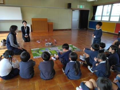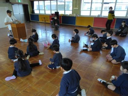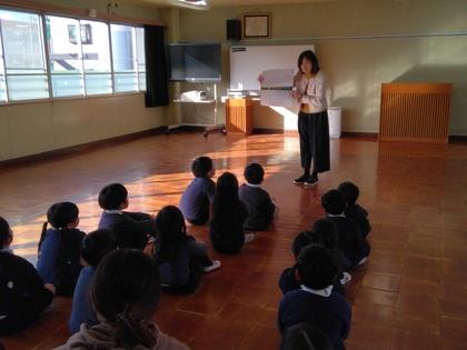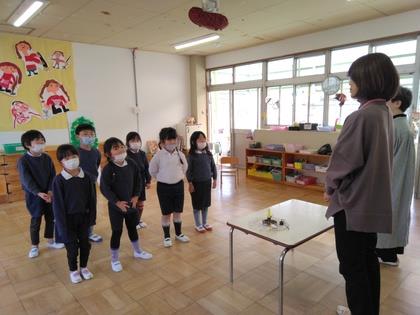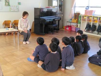 今日は『おはなしころりん』の皆さんによる“おはなし会”です。まず始めは手遊びから。年少組の子ども達、一緒に楽しみ、お行儀よく聞けるようになりましたね。