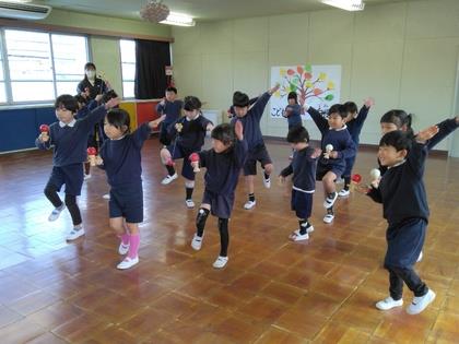 これは“けん玉バランスゲーム”の様子です。皿の上に玉を乗せて落ちないように腕を上げたり、回したり、自分が動きます。バランスを取りながらとても楽しく取り組めました。けん玉楽しかったですね。