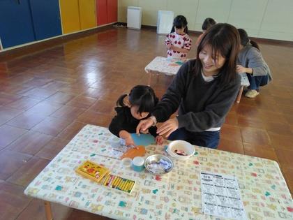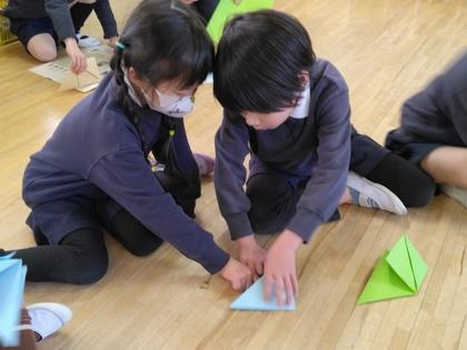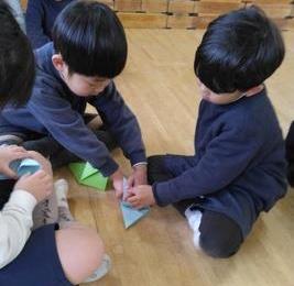 難しい所はお手伝いしてくれます。年少組のお友達。少し大きな折り紙に苦戦していたらお兄ちゃんが助けてくれました。