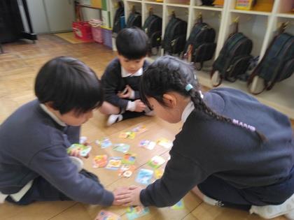 年長組のお友達がカルタをしています。チームに分かれて対戦ですよ。みんな頑張って!先生が読み札を読んでくれます。