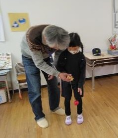 遊び終わった後「こま回し教えてくれてありがとう!」「いっぱい遊んでくれて嬉しい気持ちになったよ」と感謝の気持ちを伝え、最後は歌と手作りのプレゼントを渡しました。地域の皆様有難うございました。