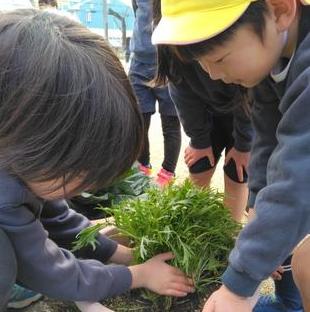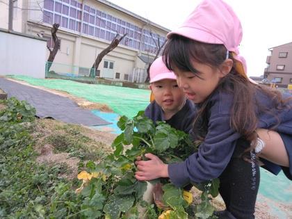こちらは水菜を収穫しています。フサフサと立派に育った水菜。年長組のお友達、2年間野菜のお世話楽しかったですね。