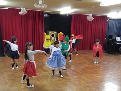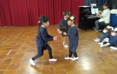 少し前から年長組も年少組も物語の登場人物になりきって表現遊びをしています。今日は年少組のお友達が年長組の様子を見にいかせてもらうことにしました。