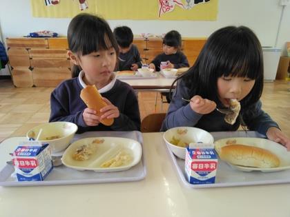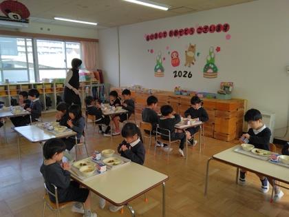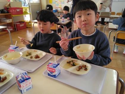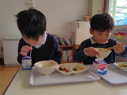 先生からメニューの紹介があった後『いただきます!』今日は年長組、年少組一緒に食べましょう。