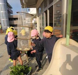 園長先生から『切干大根』の作り方を教えてもらいました。短冊に切った大根を網の入れ物に入れて天日に干します。「どんな風になるのかなあ」変化を観察です。