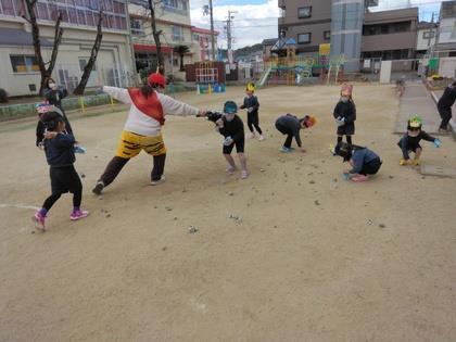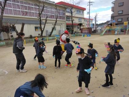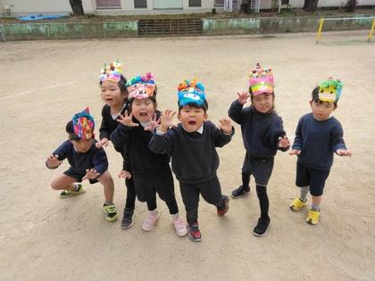 小さな鬼に変身した子ども達。大きな鬼がやってくると夢中で新聞豆を投げていましたよ。「鬼は外~!」きらりキッズのお友達、また幼稚園で楽しく遊んでね。