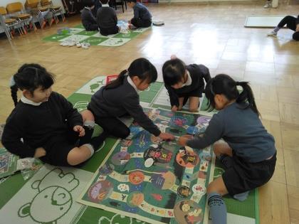 友達と教え合ったり先生に聞いたりしながらすごろくを楽しんでいます。「あっ!1回休みやあ、残念」すごろくの他には、カルタやトランプなども楽しんでいます。