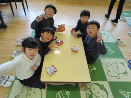 三方を作り終えた後はおやつタイムをしました。一緒に遊んだり、折り紙を教えてもらったり仲良しですね。