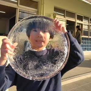前日にたらいに水をいれておいた子ども達。今日は大きく立派な氷が出来ていてびっくりです。