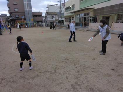 今日は地域でいつも見守ってくださっている『防犯委員』の皆さんと『民生児童委員』の皆さんに来て頂き、昔ながらの伝承遊びで一緒に遊んで頂きました。