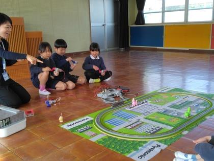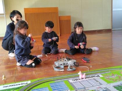 手回し発電機を何度もクルクル回すと少しずつ模型電車が進んでいきました。見ているお友達も応援してくれます。一生懸命回しました。いざ電気を作るとなるとすごいエネルギーが必要なんですね。