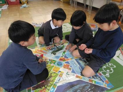 お正月遊びで出していた『すごろく』年長組の子ども達は、サイコロを振り、出た目で駒を進めています。「なんて書いてる?」「これは“○○する”だって」
