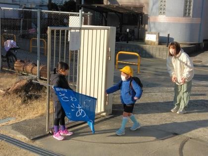 2月は、あいさつ強化月間です。担当の年長組のお友達が門に立ち、元気に「おはようございます!」と友達や保護者の方を迎え入れています。