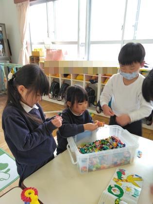年長組のお友達は昼食の後にLaQをして遊んでいます。「今日は何作ろうかなあ」「昨日の続きで○○を作ろう」様々な形のある部品で色んな物が作れますね。