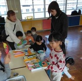 今日は未就園児のお友達が参加する『きらりキッズ』でした。テーマは“つくってあそぼう”節分に向けて鬼のお面を制作しました。まずは自分の好きな色や形のパーツを選びました。