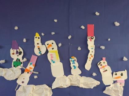 寒い日が続いています。年少組保育室の壁面制作は雪だるまです。白い画用紙を丸く切る事を頑張りました。画用紙の他にボタンを目にしたり、フルーツネットをマフラーにしたりと工夫した作品です。