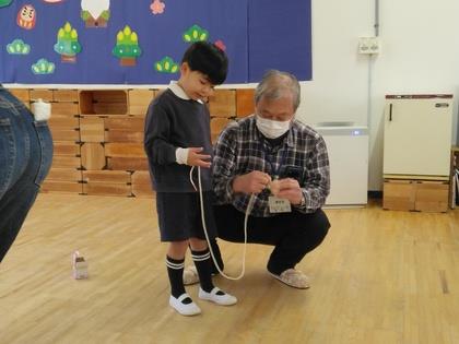こま回しに挑戦です。ひもの巻き方や、こまの持ち方、投げ方など丁寧に教えて頂きましたよ。コツをつかめるようになると上手にこまが回り、一緒に喜んでくださいました。