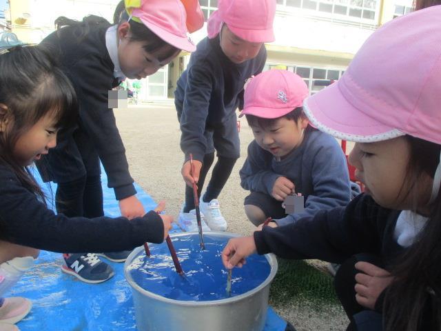 たらいやバケツに張って置いていた水が氷になっていたのです。「わぁ、冷たい~!」「ツルツルしてつかめないよ~」夢中で取り出そうとしています。