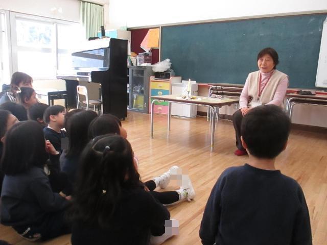 藤井寺図書館よりボランティアサークル『おはなしころりん』さんが来てくださいました。活動の中に手遊びやわらべうたを取り入れて、話のストーリーに入り込める雰囲気を作ってくださり、『冬の楽しさ』をいっぱい感じられたお話会となりました。