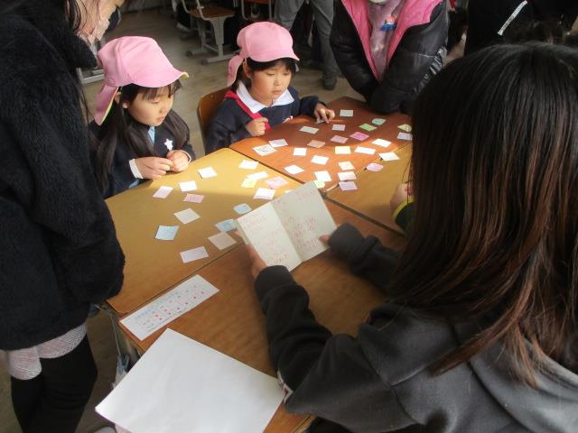 【1時間目:こくご】手作りあいうえおカルタ取りをしよう!5年生が読み手をしてくれたよ。どこにどんな文字があるかをしっかりと覚えようと、とっても集中していましたよ。