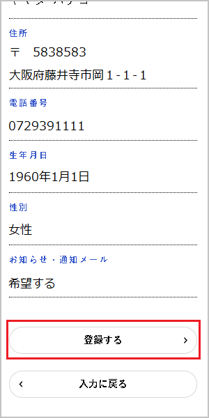 メールアドレスを2回入力し、[登録する]ボタンをタップします。