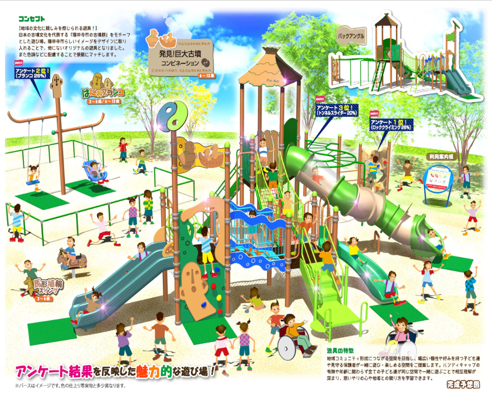 新たに設置する遊具は世界文化遺産である古市古墳群をイメージした埴輪をモチーフに取り入れたデザインの大型複合遊具とブランコ、スイングです。公園利用者に地域の歴史文化を感じてもらえるデザインとなっています。